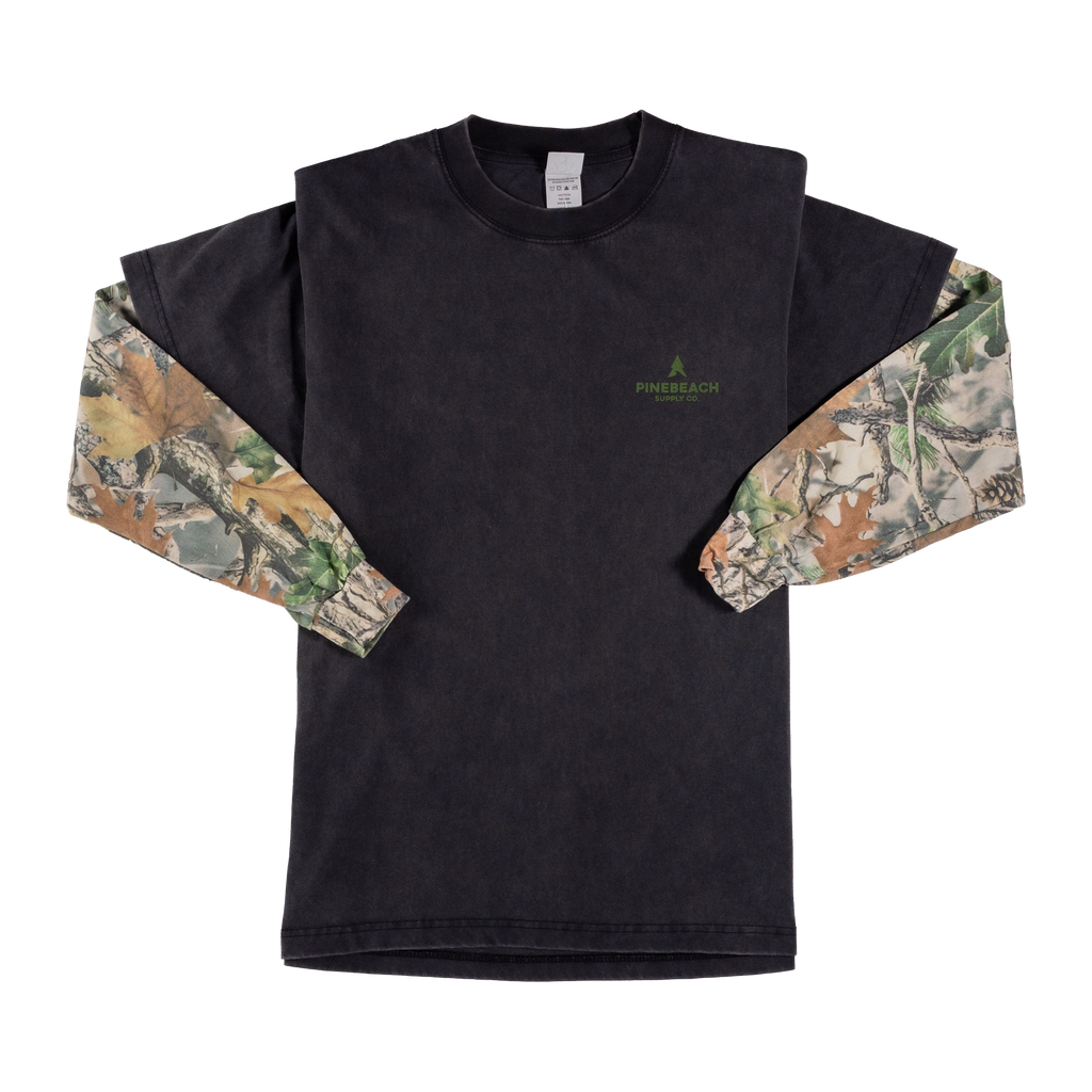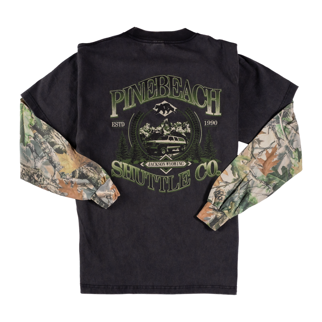 Rock that retro vibe with this oversized heavyweight tee featuring a vintage-inspired graphic of a classic truck rolling past the majestic Tetons, complete with Pinebeach Shuttle Co branding. The black body pairs perfectly with camo sleeves for an edgy, modern twist on timeless style. Built for comfort and durability, this tee delivers that coveted relaxed fit that's everywhere right now—perfect for casual days when you want to make a statement without trying too hard.